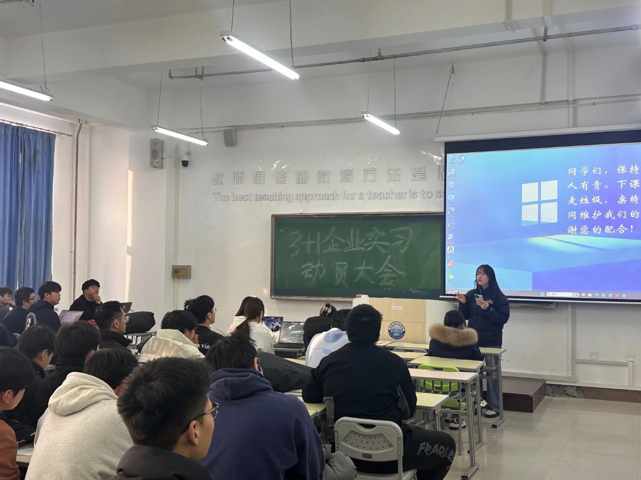 动员会上,辅导员沈欣宇详细解读了“3+1”企业综合实习就业方案。前三年扎实的理论学习为基石,第四年融入企业,以实习为路径,深度探寻就业机会。这不仅是一次实习历练,更是就业的前奏,要求同学们在实习岗位上充分展现专业所学,积极适应职场环境,明确职业定位,将实习岗位转化为未来的就业岗位,实现学业与职业的完美衔接。