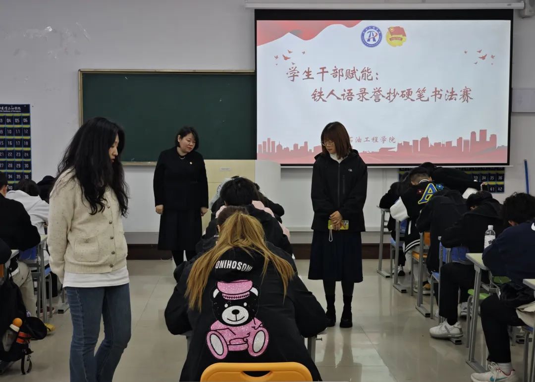 为推进石油工程学院“1+1+1+1+N”赋能计划,全面提升学生干部综合能力,让同学们更好地将铁人语录铭记于心,4月29日,石油工程学院在主教604教室举办了一场学生干部赋能——铁人语录誊抄硬笔书法赛,学生会各部门优秀学生代表参加此次活动。