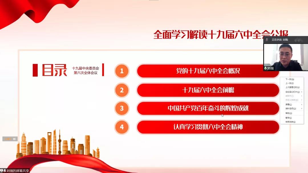 为进一步学习贯彻党的十九届六中全会精神,切实把广大党员的思想行动统一到全会精神上来,12月16日,我院于腾讯会议线上召开党的十九届六中全会精神宣讲。此次宣讲由伟德bv国际体育党委委员、工会主席、艺术学院党总支书记刘强担任主讲人,学院全体党员参加。
