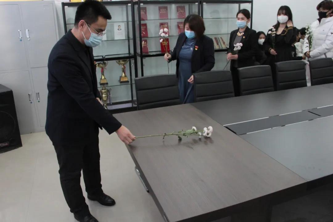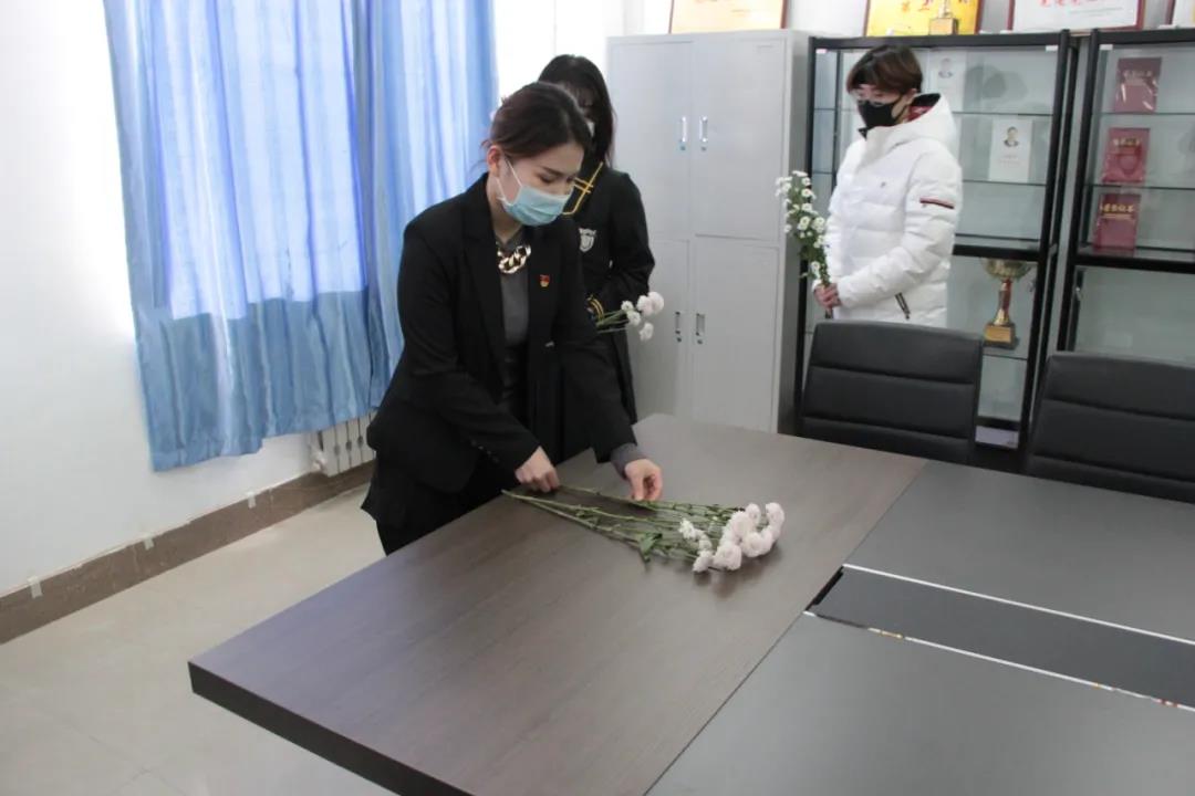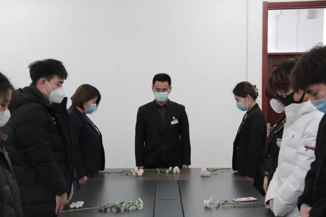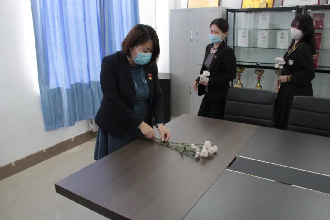 随后,刘书记带领大家进行“献花“仪式,并对逝去的同胞表示深切的哀悼。“并全体肃立默哀。