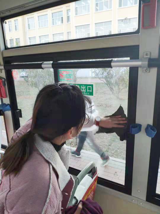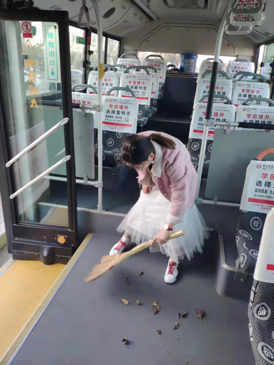 10月8日下午,彭茹斐带着扫帚和抹布独自来到219路公交车站点,正好有一辆侯客的公交车停在站台,她和司机师傅说明来意,对车厢卫生进行了一次彻底的清理,为司机师傅和广大同学营造了一个舒适、温馨、整洁的驾乘环境。得到了司机师傅的赞扬。