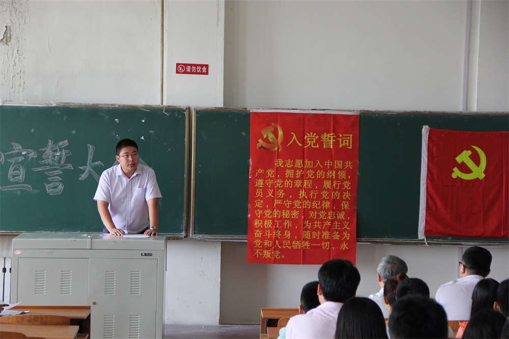 大会在庄严的国际歌中拉开序幕,系党总支书记毛雷在致辞中加入党组织的同志表示祝贺与欢迎,同时新同志提出了殷切希望,希望他们保持思想政治上的先进性,坚定不移地用科学理论武装自己的头脑,工作与生活中要带头学习、带头服务、带头弘扬正气谱写石油工程系气正风清的新篇章。19名新党员怀着严肃与神圣的心情,在领誓人的带领下,面对鲜红的党旗举起右手,庄严宣誓:“我志愿加入中国共产党,拥护党的纲领,遵守党的章程,对党忠诚,积极工作,为共产主义奋斗终身,随时准备为党和人民牺牲一切,永不叛党。”新党员用他们铿锵有力的誓言,向表达了自己的无限忠诚。新党员代表孟德志、入党积极分子李搏随后发言,向组织表明了自己的信心与决心