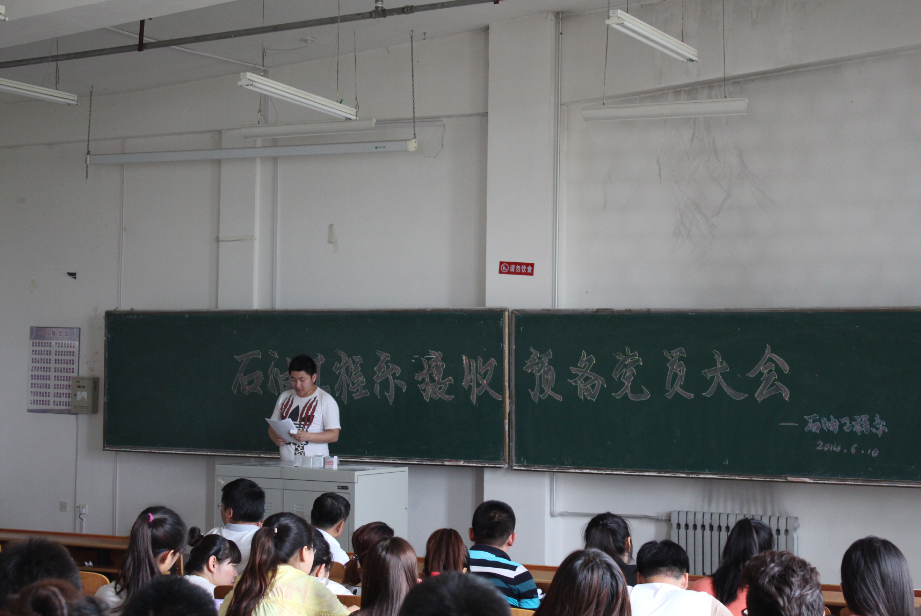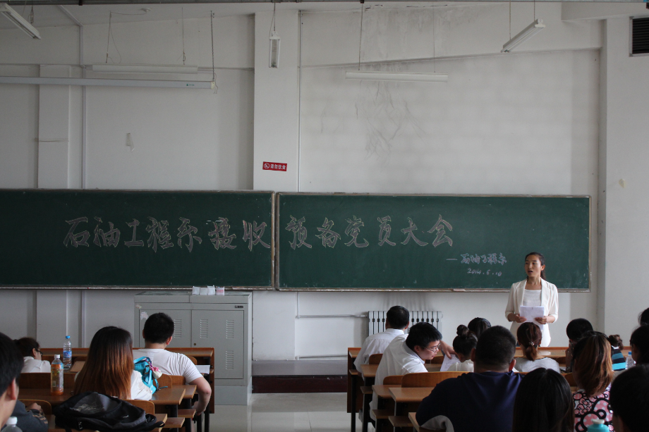 2014年6月10日中午,石油工程系学生党支部在主教430召开接收预备党员大会。大会主要议题是讨论关于李泽等24位新同志入党接收问题。党总支书记金铁钢、副书记孙金莹出席了会议。石油工程系党总支全体党员参加了会议。大会由副书记孙金莹同志主持召开。