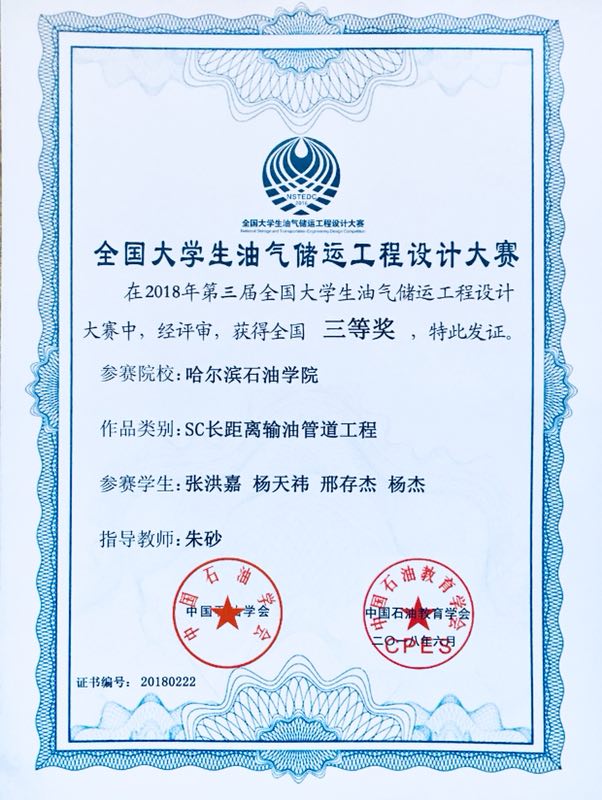 油气储运工程学生荣获“第三届全国大学生油气储运工程设计大赛”三等奖