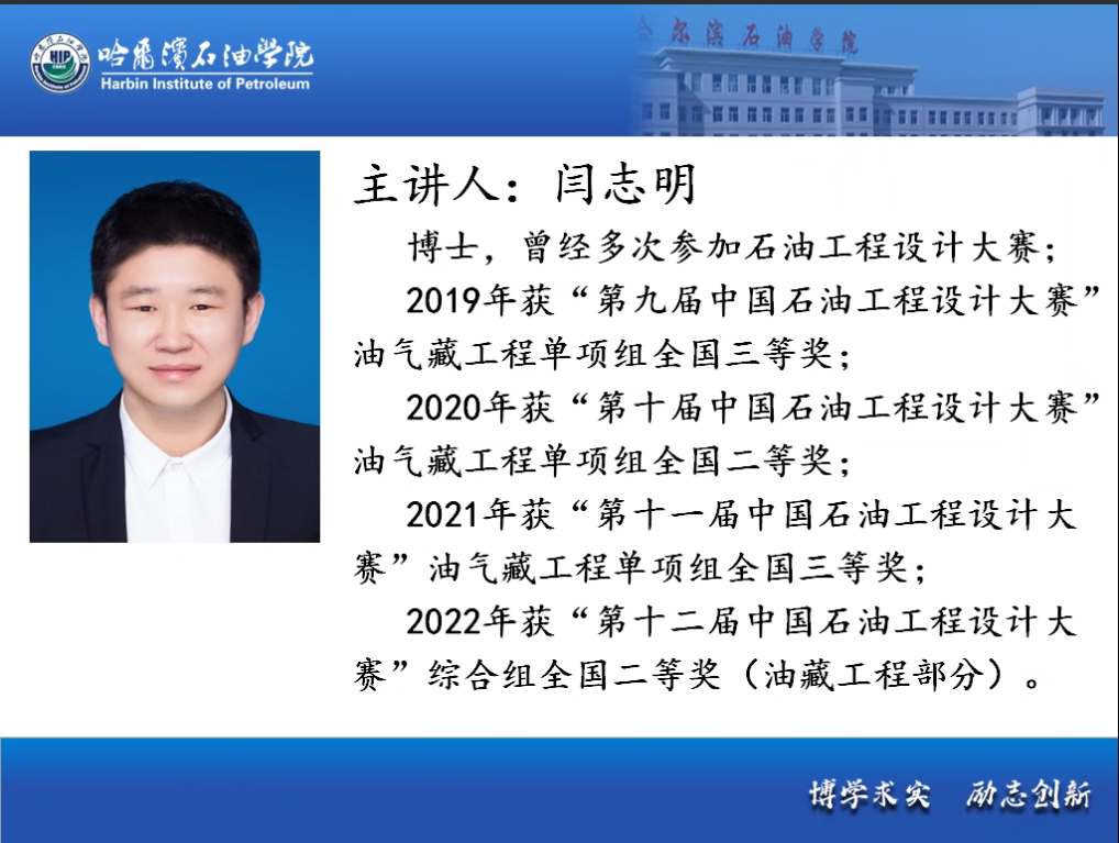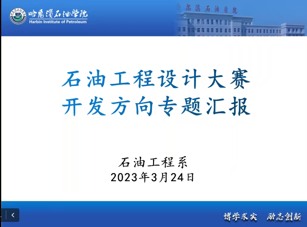 2023年3月24日下午6点30分,我院石油工程系线上举办“石油工程设计大赛开发方向专题汇报”教研活动,李岳祥院长邀请到东北石油大学博士研究生闫志明老师、王凤娇老师、胡超洋老师为全体石油工程系师生做专题汇报。