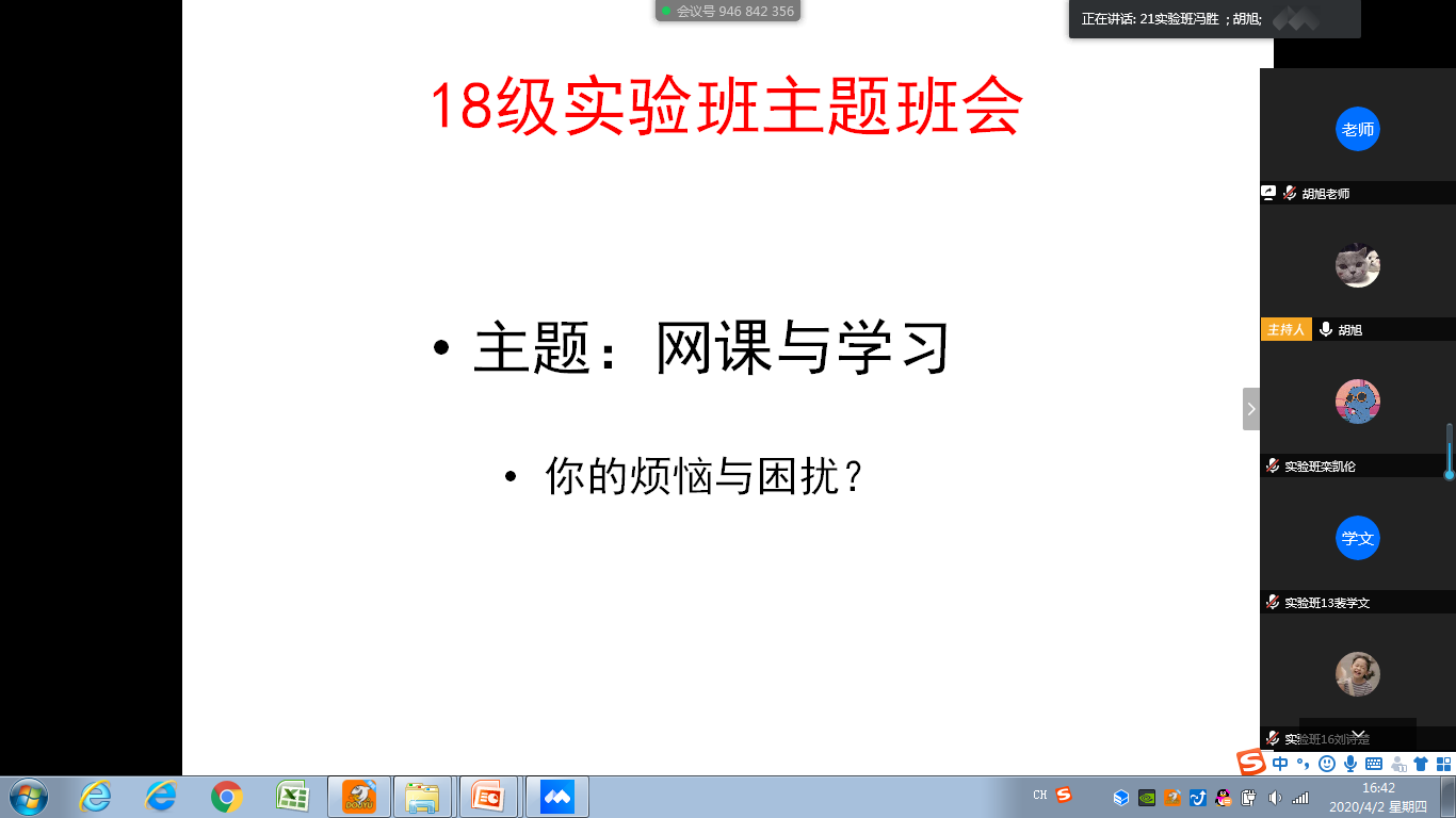 由于新冠疫情导致的“网课学习”已经在同学们与教师们的共同努力下顺利进行一个月有余,这一个多月来,教师与学生共同秉持“停课不停学”的理念,严格要求自己,顺利保证了教学工作的进行。针对这一个多月来的学习过程,从开始的不熟悉与新鲜感,逐渐走向日常化和倦怠化。从“传统教室”模式的课堂转变为“居家网课”模式的课堂,这其中一定有苦有甜。因此,2018级实验班在班主任胡旭老师的提议下,召开了以“网课与学习,你的烦恼与困扰”的主题班会。会议过程中师生们畅所欲言,共同聊了聊网课那些事儿。