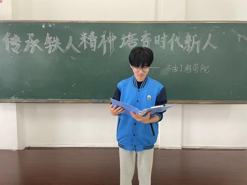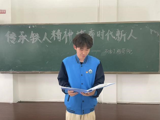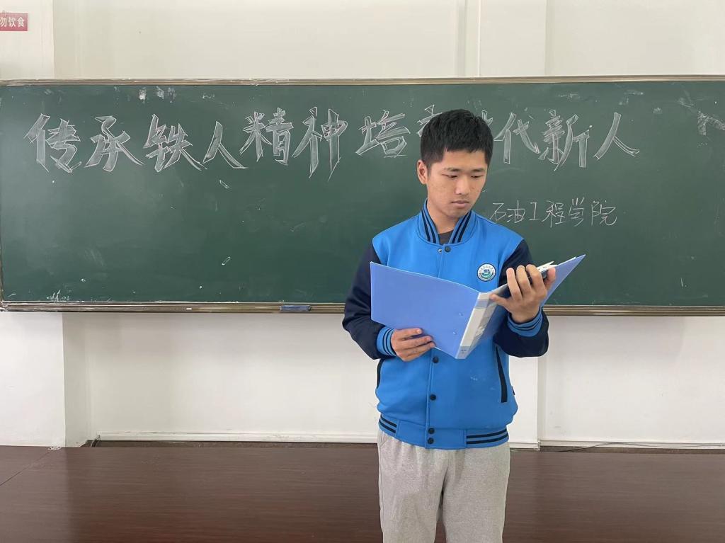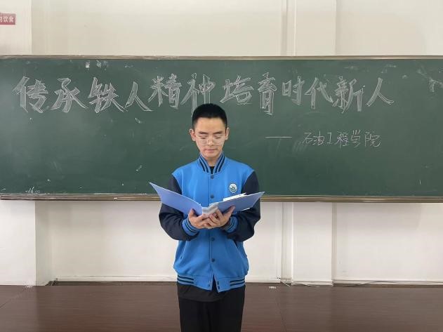 活动中,同学们围绕主题讲感悟、谈收获、话成长、绘未来,激情饱满讲述铁人的真实故事,字里行间表达了对铁人的赞扬与缅怀,对铁人光辉一生的敬仰。声情并茂地讲出“铁人精神”的热血,表达出“请党放心,强国有我”的坚定信念和豪情壮志,诠释了强国复兴路上“吾辈当自强”的使命担当,展现了新时代石油学子勇挑重担、主动作为的时代群像。一个个鲜明的例子、动人心弦的话语,带领在场同学走进那段艰苦卓绝开展会战,斗志昂扬为国产油的激情岁月,同学们都为铁人“有条件要上,没有条件创造条件也要上”的艰苦奋斗精神所感染,为铁人“宁肯少活二十年,拼命也要拿下大油田”的拼搏精神所鼓舞。