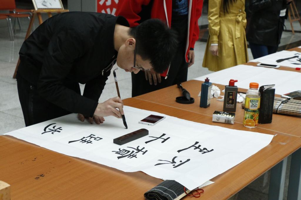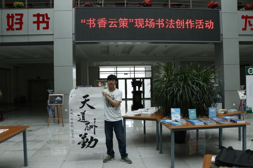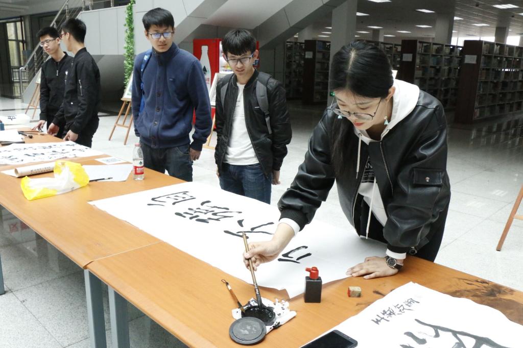4月25日中午12:30,图书馆联合校“云策”书法协会在图书馆一楼阳光大厅共同举办了主题为“书香云策”的现场书法创作活动,“云策”书法协会的十余名同学参加了本次活动,现场书写了四十余幅毛笔字作品。现场还有很多书法爱好者前来观摩,他们与书法协会的同学们一起切磋书法创作的心得,并现场做了临摹练习。