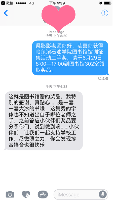 历时一个月的馆训征集活动已经圆满结束,6月29日下午,获奖读者来图书馆领取奖品,奖品是图书馆为大家精心准备的图书,小小的礼物感谢老师和同学们对图书馆工作的支持和热情参与!