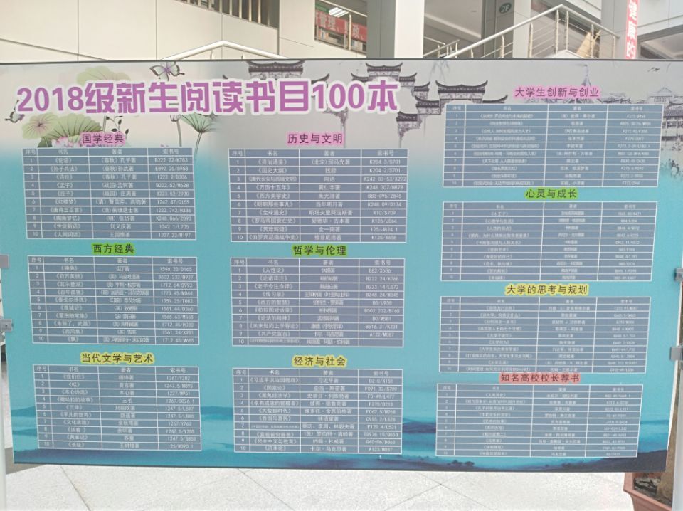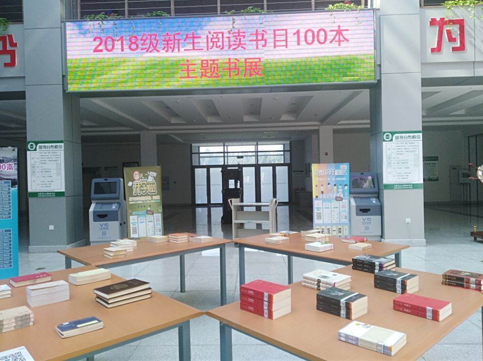 为迎接2018级新生的到来,图书馆精心挑选了100本适合新生阅读的书目,书展在一楼阳光大厅展出,并为新生开通借书绿色通道:
