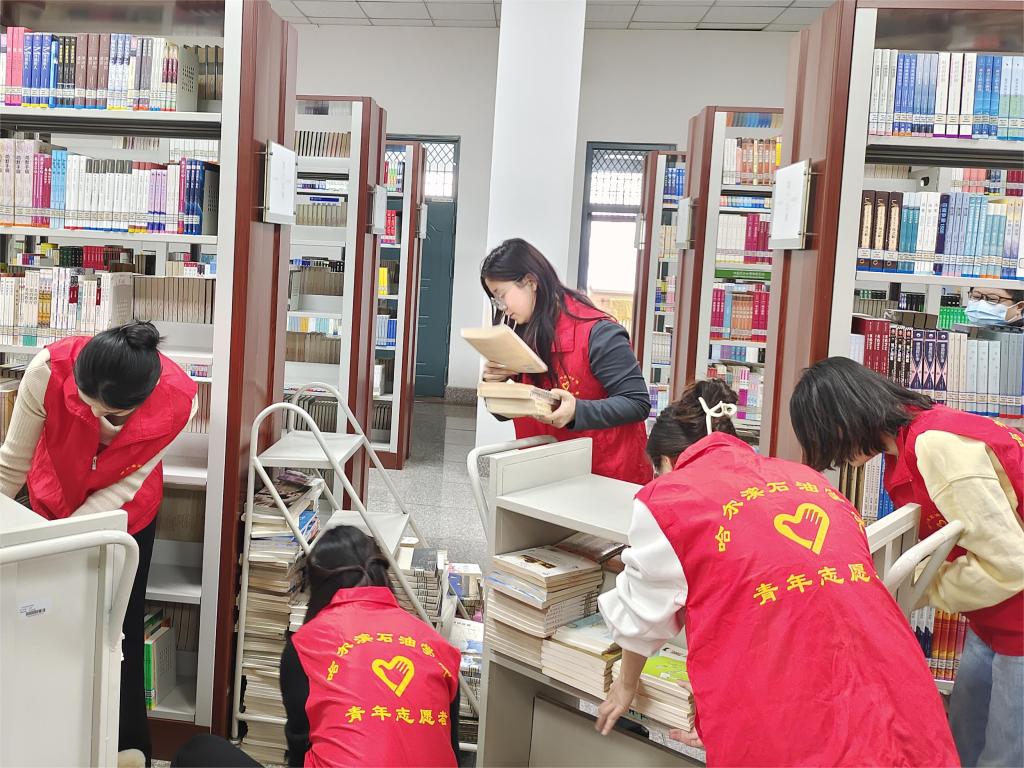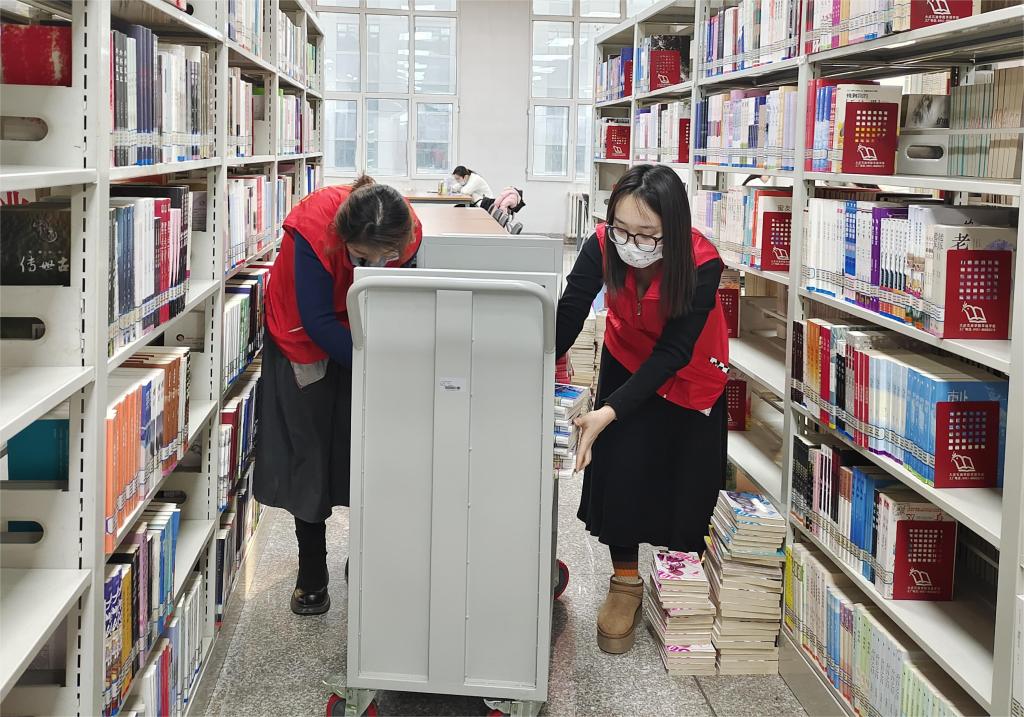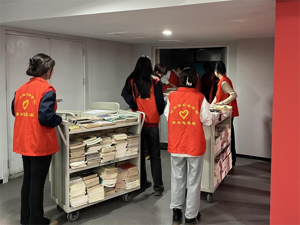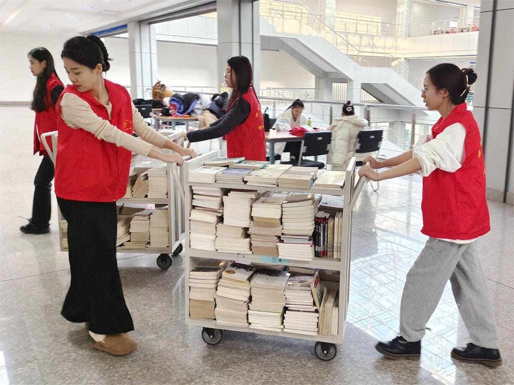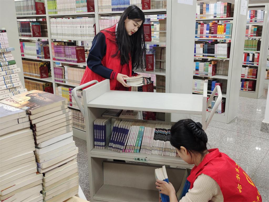 伴随着图书馆空气中淡淡的墨香和翻书页的摩挲声,志愿者们协助图书管理员开展日常工作。主要工作内容为搬运图书、运输图书、分类摆放等。他们认真聆听、仔细记录,按照要求将运送图书分类上架。工作分工明确,互相配合,过程井然有序,各司其职,耐心细心的工作态度得到了图书馆工作人员的感谢与肯定。