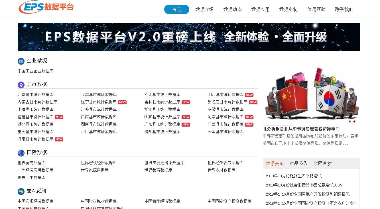 EPS全球统计数据/分析平台(简称EPS数据平台)是集丰富的数值型数据资源和强大的分析预测系统为一体的覆盖多学科、面向多领域的综合性信息服务平台与数据分析平台。通过对各类统计数据的整理和归纳,现已拥有74个专题数据库,并形成国际数据、宏观经济、金融市场、产业运行、区域经济、贸易外经、资源环境、县市数据、人文社科数个系列的数据库集群,总数据量近40亿条。