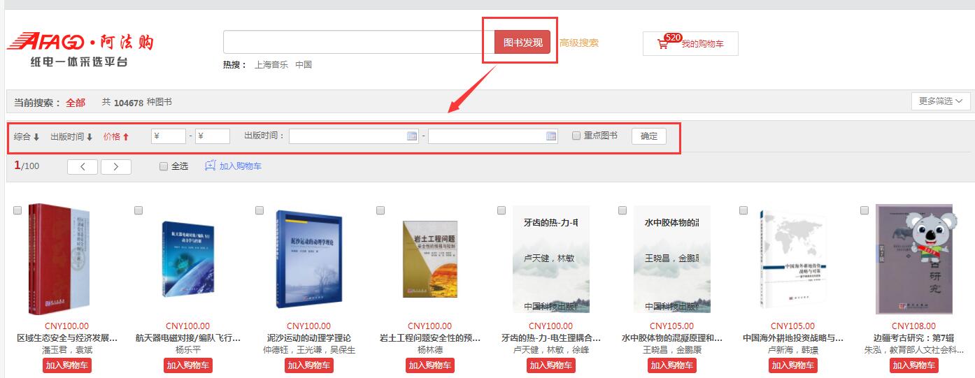 需要的图书直接加入购物车即可。系统还可根据图书的综合评分、出版时间、定价排序。也可按价格区间、出版时间段、重点图书进行筛选。
