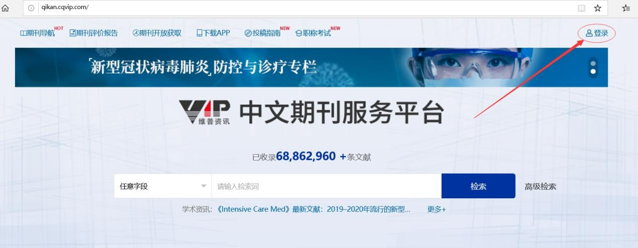 1、在浏览器中输入:qikan.cqvip.com 进入首页,然后点击右上角的【登陆】: