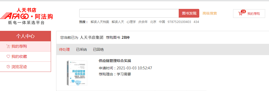 5、我的荐购:【个人中心】→【我的荐购】 中可查看到所有的荐购书目,及图书馆的采纳情况。