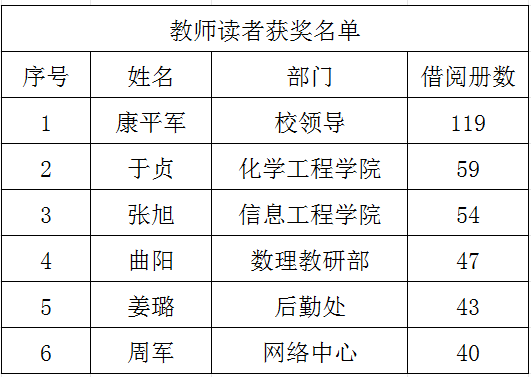 为进一步提升校园文化,发挥阅读在人才培养中的积极作用,深入推进全民阅读,积极建设书香校园,读书节期间,图书馆举办了“阅读之星”评选活动。根据年度借阅总量,对全校排名前六的教师读者,授予“阅读之星”称号。现将2024年度获奖名单公布如下: