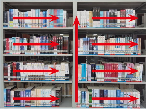 图书和期刊在书架上按索书号的大小由上到下、由左到右呈“Z”字形排列,如下图所示。