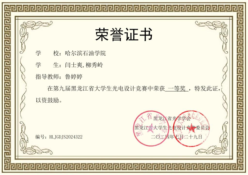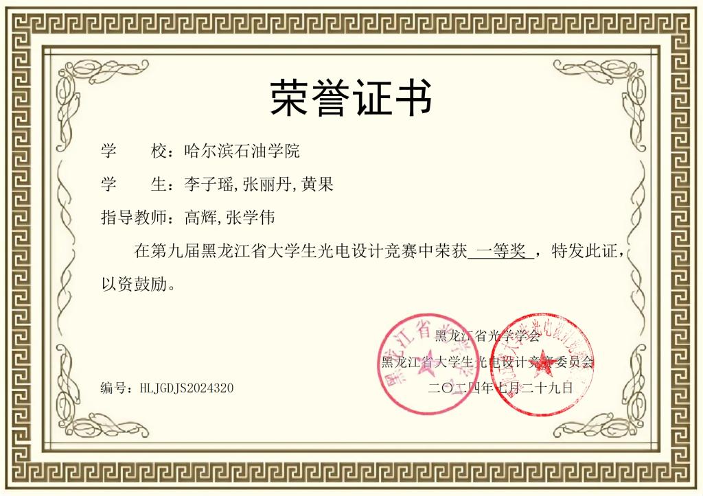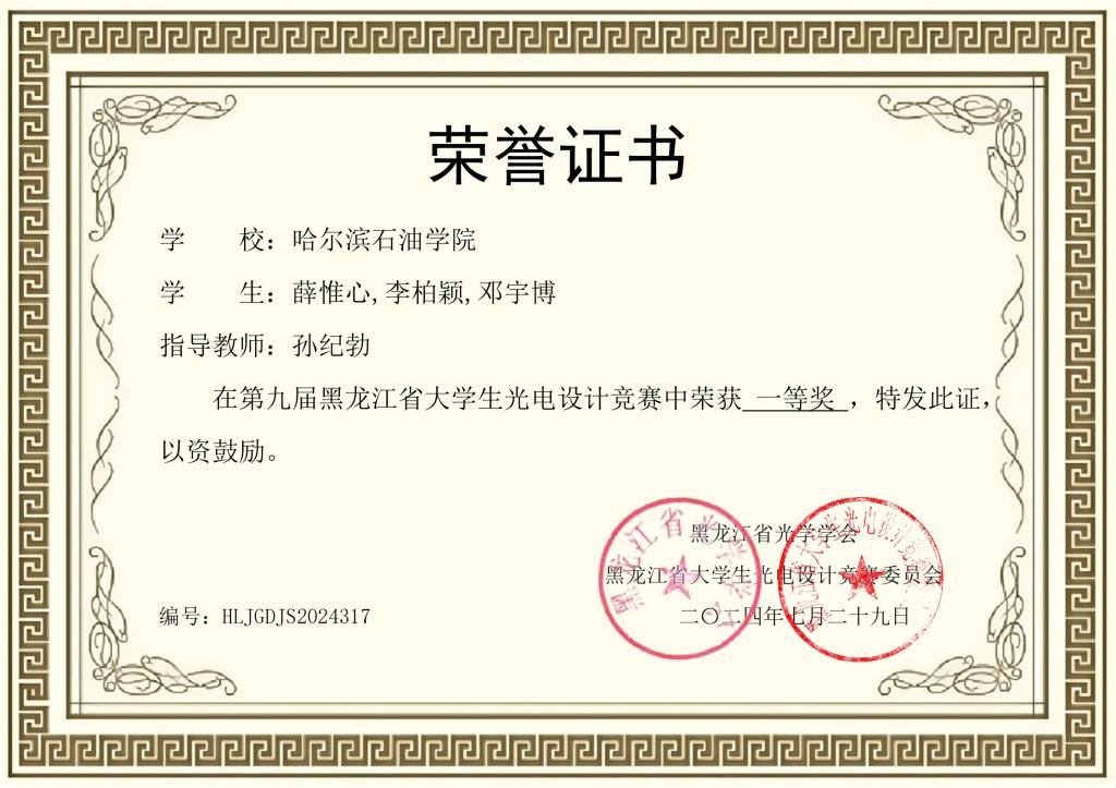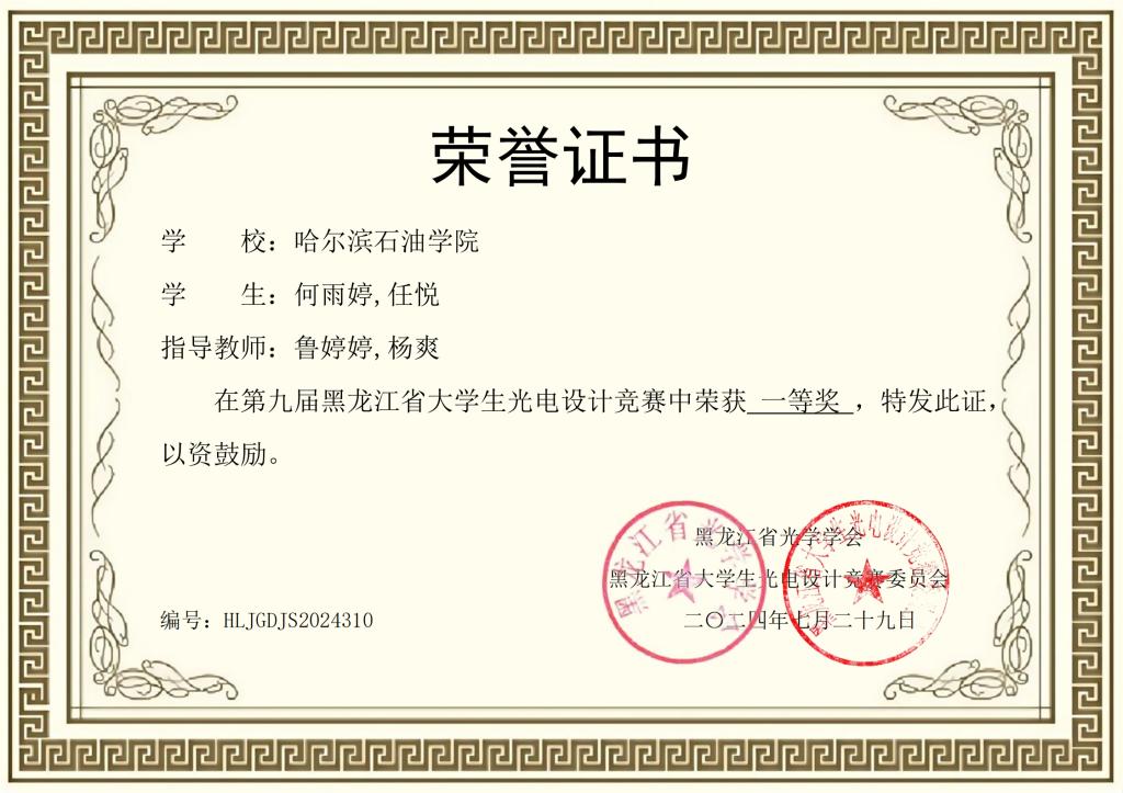2024年第九届黑龙江省大学生光电设计竞赛中荣获一等奖名单