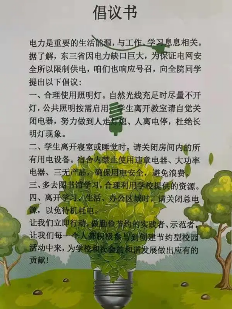 为响应东北限电措施,号召同学们节约用电,形成“节约用电、绿色用电”的风气,积极行动起来,用实际行动尽可能节约每一度电,外国语学院于10月27日开展了“节能多尽力,未来多美丽”节约用电志愿服务活动。