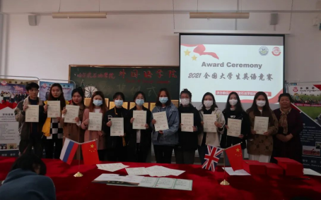 在颁奖仪式中,外国语学院院长王莉娅,高丽娜副院长分别为全国大学生英语竞赛一等奖张庆、田佳佳,二等奖刘印梅、高宇琪,三等奖廖杰来、李野等同学颁发奖状。