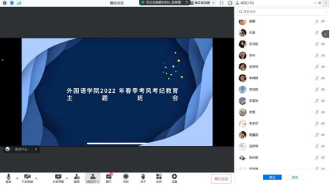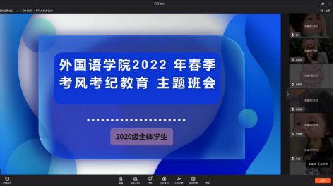 为进一步规范考风考纪,构建诚信校园,确保大学英语四六级考试及学期末考试顺利进行,倡导端正考风、严肃考纪、诚信应考,外国语学院以线上线下相结合的方式开展2022年春季考风考纪教育主题班会,会议分别由孙晓萍、赵连琦、郑智慧三位辅导员以及王慧宇老师主持召开,外国语学院全体学生参与本次会议。