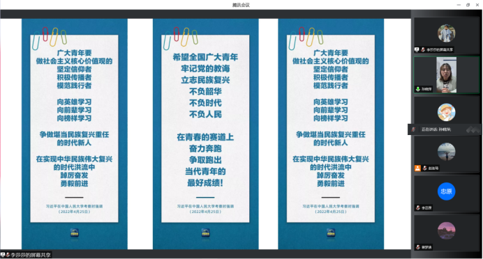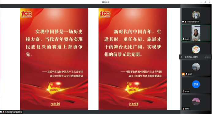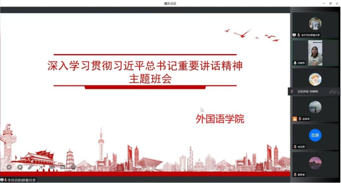 为深入学习贯彻习近平总书记《在庆祝中国共产主义青年团成立一百周年大会上重要讲话》和《习近平总书记在中国人民大学考察时重要讲话》两次重要讲话精神,动员带领广大青年与党同心、跟党奋斗,坚定理想信念,勇担时代使命,争当发展先锋,外国语学院组织于6月1日在腾讯会议开展深入学习贯彻习近平总书记两个重要讲话精神主题班会。班会由各年级辅导员老师主持,全体同学参加会议。