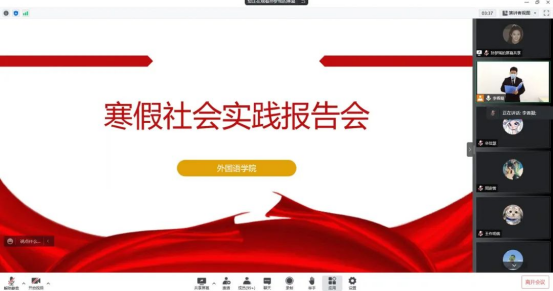 通过开展本次寒假社会实践报告会,同学们一起畅谈交流寒假社会实践的心得,并在实践中积累社会经验,在实践中提高自己的能力,外国语学院学生将继续贯彻奉献服务精神,牢记使命,奋发向上,为新时代中国特色社会主义的发展建设贡献更多的青春力量!