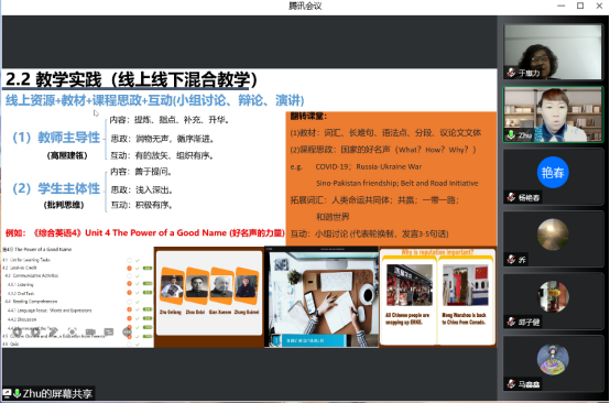 大学外语部黄迪老师介绍了自己在《大学英语IV》线上课堂中一些优秀的课堂管理技巧,如何配合数字版教学资源进行混合教学,以及如何根据单元设计课程思政主题。郑泽宁老师展示了如何利用Welearn进行混合式教学,展示了过程性评价中的经验做法。