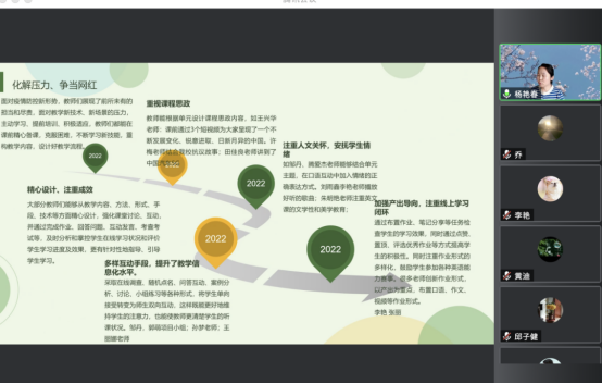 首先,杨艳春老师代表督导组进行了总结,介绍了本学期线上听课的情况,介绍了督导听课中发现的亮点与特色,学生和教师层面的表现,并对督导的工作提出了畅想与展望。