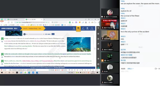 课中,黄老师除了对本课的重点,难点进行讲解之外,还布置任务,以学生为中心,引导学生通过自主学习来深入理解本课的知识点。例如,让学生观看中国大学慕课网站上优质慕课的相关章节,以任务为导向,和学生们在腾讯会议聊进行本课的相关问题讨论与答疑。除教书外,教师还肩负着育人的责任,在讲述开学第一课“海洋探索”时,黄老师先与同学们探讨了人类在海洋探索与科学发展方面起到的积极作用,后结合新冠疫情,和同学们谈起中国的医务工作者在此次疫情中做出的贡献,进一步向学生宣传国家为疫情防控所做出的诸多努力以及个人做出的奉献和牺牲,以此激励学生的爱国热情,把思想引导和价值观塑造融入本课的教学之中。
