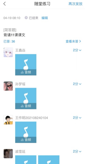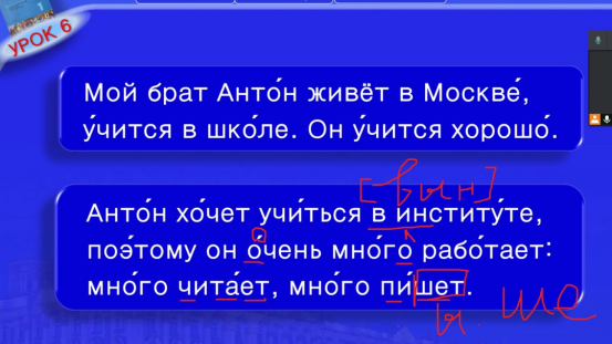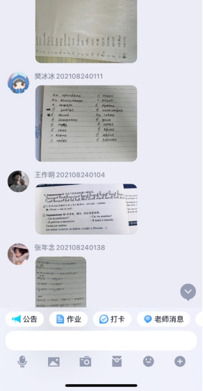 针对线上、线下教学媒介差异性所带来的教学形式的改变,孙悦老师秉持“两手抓”的原则,提升线上教学质量。教学过程中使用超星学习通+QQ群+腾讯会议这三种方式结合开展线上教学。在授课前会在腾讯会议里面分享与本堂课相关俄语歌曲、动画短片,快速激活课堂,并且能将思政元素融入课程设计,使学生快速进入到学习氛围中,使用超星学习通进行课堂签到和随机点名的方式和同学们互动交流,在授课时使用腾讯会议共享屏幕的方式,供学生同步观PPT,重点、难点的地方会进行屏幕互动,指出所需强调的内容,在课堂练习中,采用把答案拍照上传至QQ群中,一对一进行指导分析,为巩固学生对知识点的掌握程度,课后会在超星学习通里发布讨论话题,发布任务,学生上传音频视频,有问题的地方会及时在学习通内回复,检验学生对上一次课程内容的掌握情况,既推动学生课后复习,帮助同学温故而知新,又与下次授课内容形成衔接。另外,由于网络授课时长有限,采取类似于翻转课程的方式,每次课后会给学生布置作业,同时发布下次课程学习的章节内容,要求学生们提前预习。