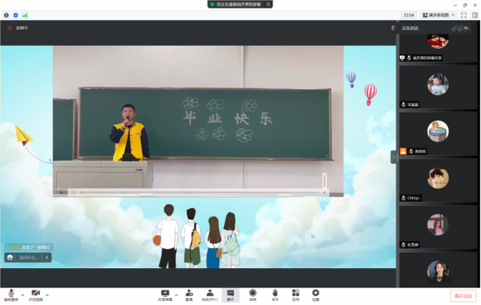 毕业欢送会在回忆视频中拉开序幕,同学们一同回忆了大学四年的美好时光。随后由李月颖和孙梦彤同学带来俄语歌曲《春天》,表达了对青春的怀念。