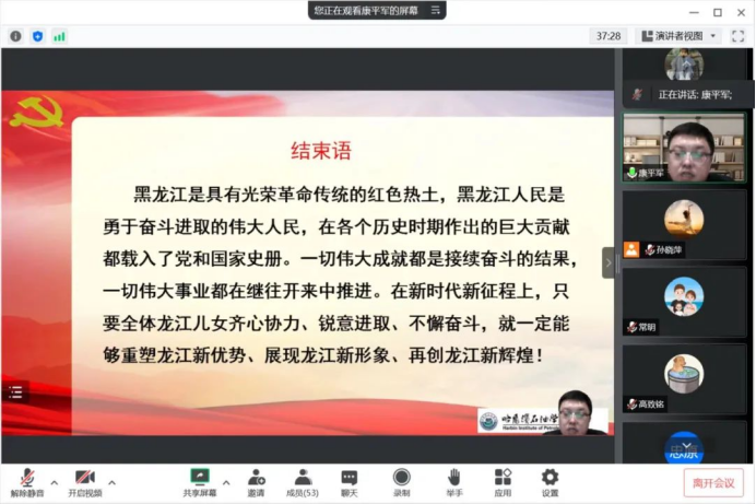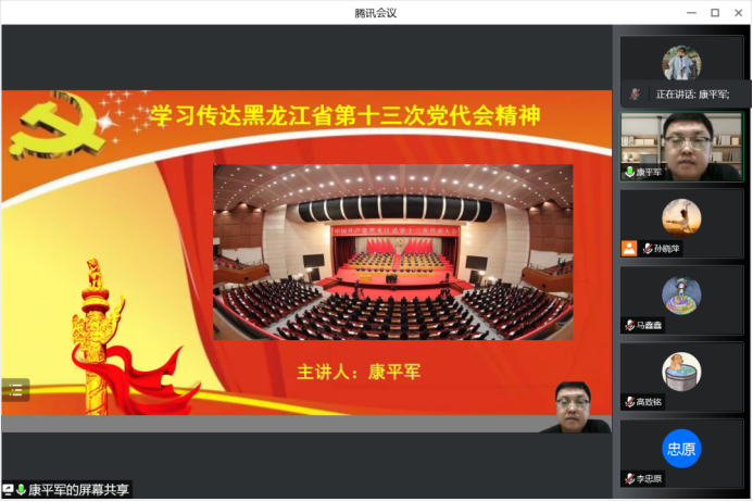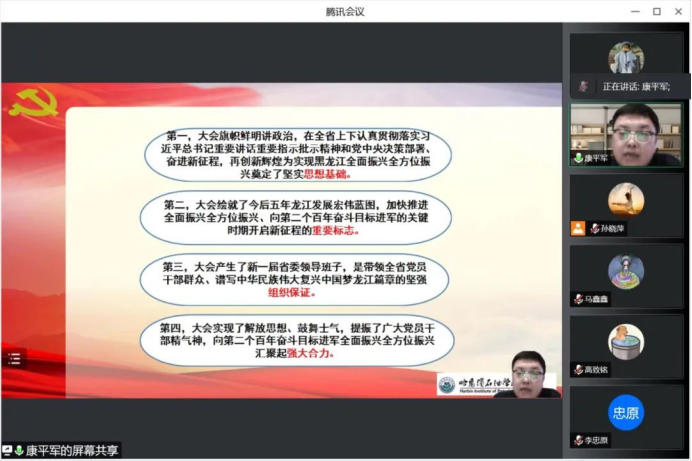 校长助理康平军从以下三个角度讲解了省第十三次党代会精神。一是黑龙江省第十三次次党代会概况。此次大会高举中国特色社会主义旗帜,坚持以习近平新时代中国特色社会主义思想为指导,深入贯彻习近平总书记讲话重要指示精神,践行初心,勇担使命,为实现黑龙江全面振兴,全方位振兴而奋斗。二是充分认识,深刻领会省第十三次党代会的重要意义。大会为黑龙江全面振兴,全方位振兴奠定的坚实的思想基础;大会是向第二个百年奋斗目标进军的关键时期,开启新进程的重要标志;大会产生了新一届领导班子,这是带领全省党员谱写伟大复兴中国梦的组织保证;大会实现了解放思想,鼓舞士气,提振了广大党员的精气神,为向第二个百年奋斗目标进军汇聚起了强大合力。三是黑龙江省第十三次党代会的基本精神。党代会报告分为以下四大部分:首先,全面建成小康社会,全省各项事业取得新成效;其次,始终沿着习近平总书记指引的方向容易前行,以坚定信心和航扬斗志,再创龙江新辉煌;然后,以新发展理念引领高质量发展奋力推进全面振兴全方位振兴开创新局面;最后是全面加强党的建设,在新的赶考之路上展现新作为。