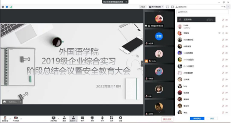 为进一步做好2019级学生实习就业工作,帮助同学尽早熟悉就业政策、了解就业形势、把握就业机会,外国语学院于8月18日在腾讯会议平台上召开了2019级企业综合实习阶段总结会议暨安全教育大会,会议由辅导员郑智慧主持,外国语学院副院长高丽娜、外国语学院党总支书记孙晓萍以及2019级全体学生参与本次会议。