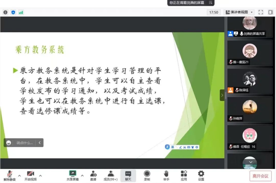 首先,陈泽钰老师向所有学生介绍了伟德官网使用的新教务系统和雨课堂的主要功能,同时也向同学们传达了学校和学院关于线上教学的各项要求。他强调所有学生要严格遵守学校的作息时间表,每堂课提前十分钟进入雨课堂教学平台,上课时全程开启摄像头,积极参与课堂学习。随后,刘燕示范了雨课堂的使用方法,以及如何使用教务系统。