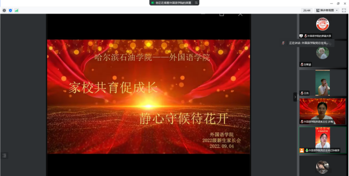 为促进家校互动联系,共同做好新生的教育培养工作,9月4日晚,外国语学院召开以“家校共育促成长,静心守候待花开”为主题的线上新生家长会。会议由外国语学院党总支书记、新生辅导员孙晓萍主持召开,院长王莉娅、副院长高丽娜、团总支书记赵连琦、英语系主任许梅、俄语系主任乔雪以及全体新生的家长出席本次会议。