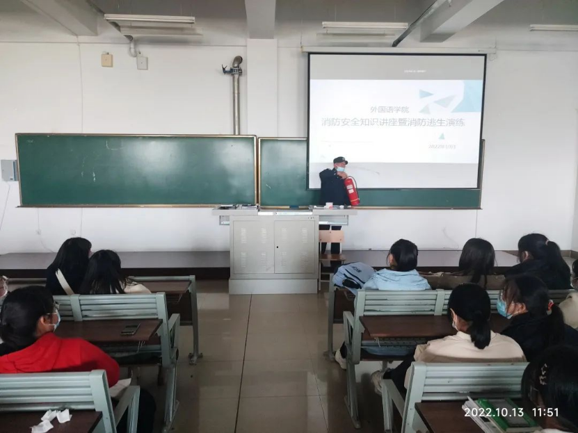 为切实加强校园安全工作,普及校园安全常识,提高学生消防安全防范意识和自防自救技能,外国语学院于10月13日开展安全消防演练活动。