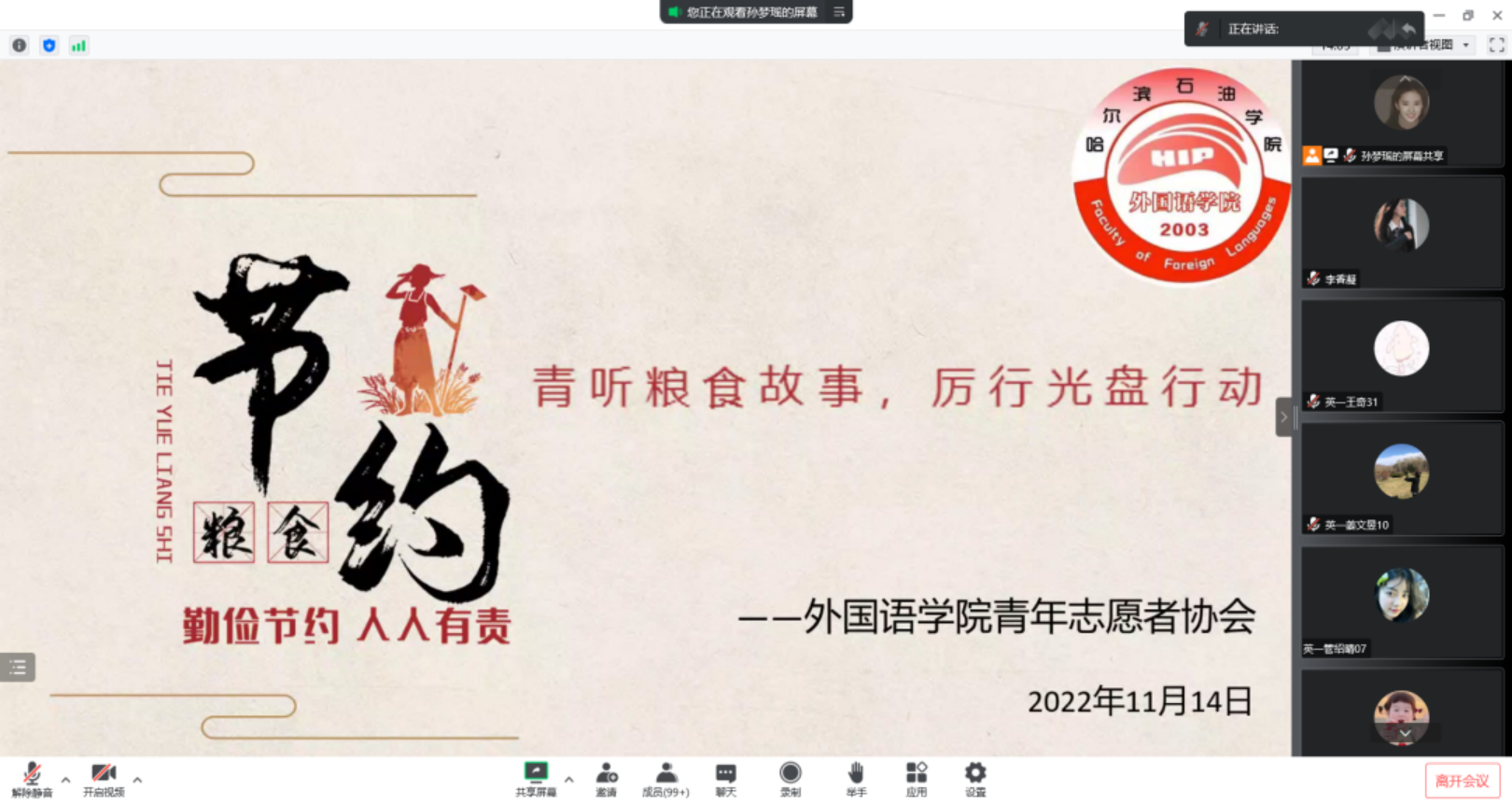 为了不断增强“节约光荣、浪费可耻”意识,大力提倡勤俭节约,坚决反对铺张浪费,弘扬中华民族传统美德,外国语学院于2022年11月14日采用线上线下相结合的方式开展了“‘青’听粮食故事,厉行光盘行动”活动,提倡我们青年人要杜绝餐桌浪费,守住中国人粮食安全,从光盘行动开始。