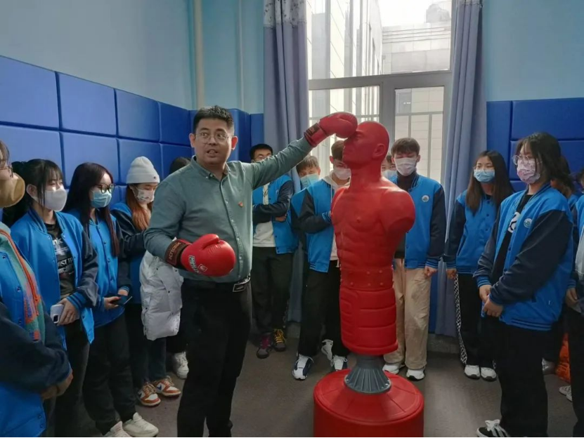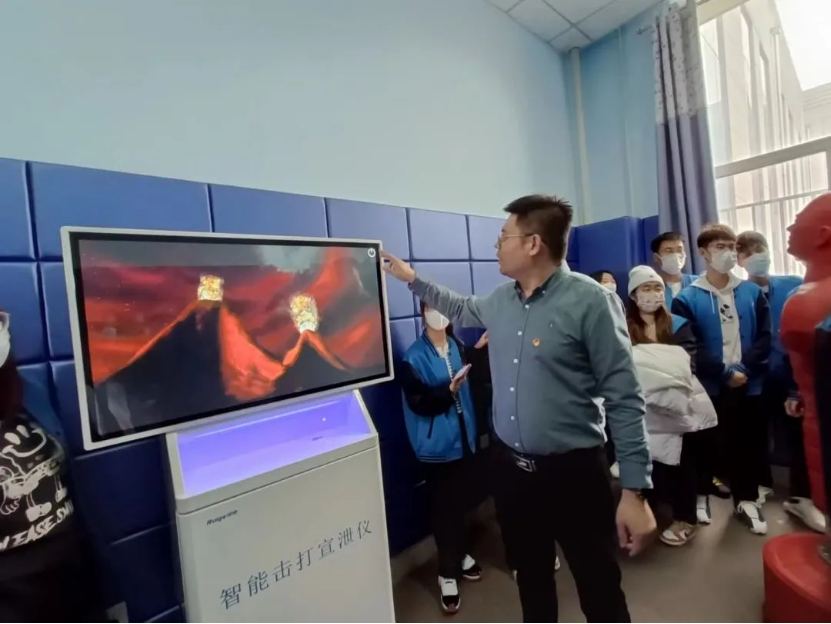 随后,带领同学们依次参观了心理健康中心的沙盘游戏室、音乐辅导室、情绪宣泄室、团体辅导室等功能区。同时介绍了具体用途,主要借用专业设备、休闲玩具辅佐心理老师了解学生内心想法,提供有效方式,让学生宣泄自己的情绪,释放压力,放松自己。