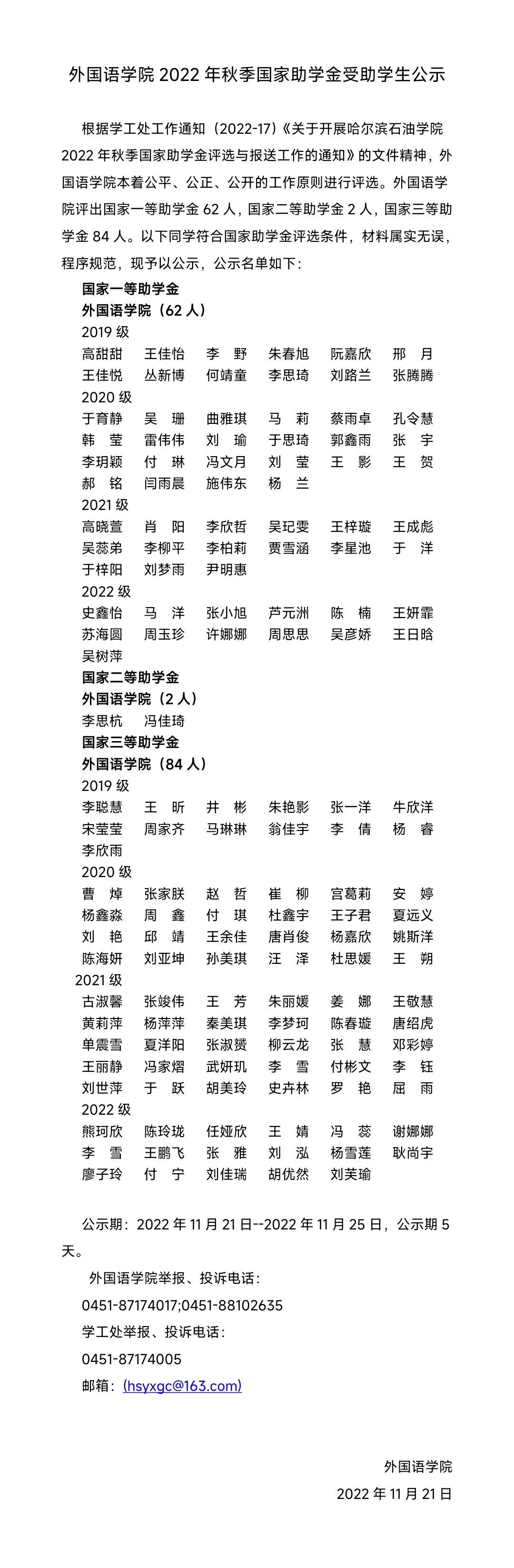 [外国语学院]我院2022年秋季国家助学金受助学生公示