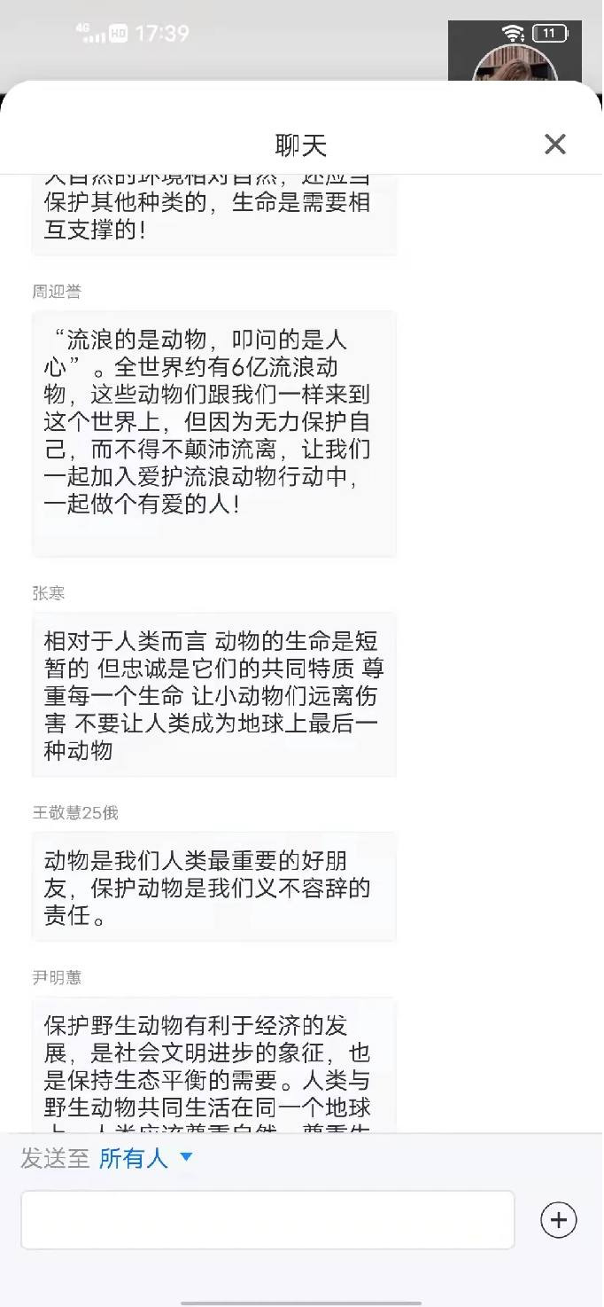 通过这次线上会议,同学们更加深入的了解到保护野生动物的重要性。动物是人类的朋友,它们都是地球大家庭的一员,保护动物从自身做起,从身边做起,相信大家的保护意识会越来越强。保护动物,维护自然生态平衡,关系到人类的生存与发展。所以,作为大自然中的一员,我们应该从自己力所能及的事情做起。