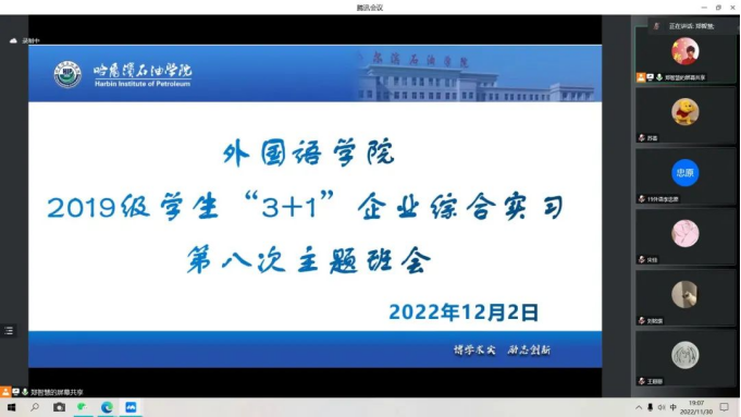 为增强安全意识,普及安全意识,提高2019级实习生自我安全保护能力。外国语学院于12月2日在线上召开2019级学生“3+1”企业综合实习第八次主题班会,会议由辅导员郑智慧主持。