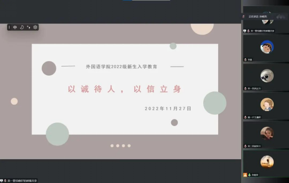 为进一步加强校园诚信建设,加强同学们的诚信意识,营造良好的诚信氛围和育人氛围,外国语学院于2022年11月27日开展新生诚信教育活动,由外国语学院党总支书记孙晓萍主持会议,22级全体新生参与。