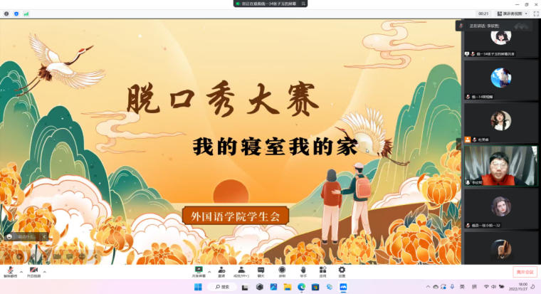 为使同学们在疫情防控下保持乐观积极的心态,丰富同学们的课余生活,增进寝室同学之间的感情,外国语学院于11月27日在线上开展了“我的寝室为我的家”脱口秀大赛,外国语学院全体同学参与。