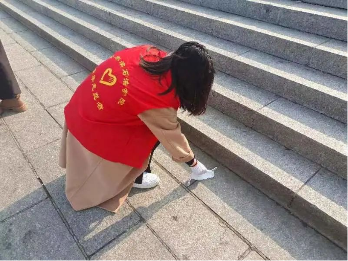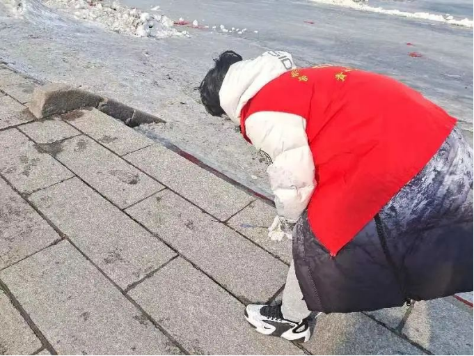 松花江,活跃着一群红色、蓝色交错的身影,形成了松花江上最亮丽的风景。志愿者们手戴白色手套对松花江江边进行清理。志愿者们分工合作、相互配合。经过一个多小时的努力,松花江面貌焕然一新。