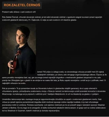 ROK ZALETEL ČERNOŠ是斯洛文尼亚共和国青年艺术家的杰出代表,他曾参加柴科夫斯基国际音乐比赛等多个国际顶级赛事,并取得了骄人的成绩,被誉为斯洛文尼亚共和国的“小提琴王子”。