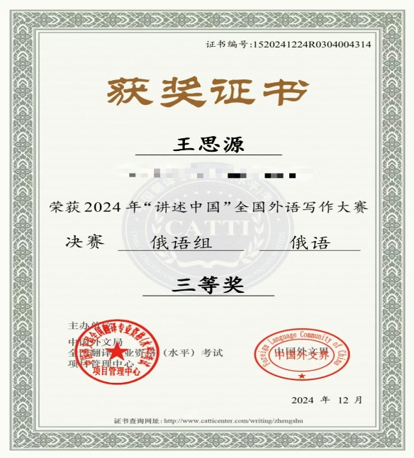 2024年11月和12月,由中国外文局CATTI项目管理中心、中国外文界主办的2024年“讲述中国”全国外语写作大赛于线上举行。外国语学院23级俄语专业王思源同学参加俄语语种比赛,分别荣获全国外语写作大赛俄语组初赛阶段三等奖和决赛阶段三等奖。