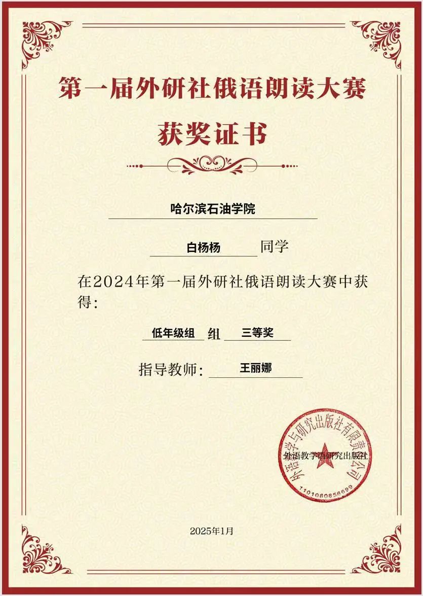 2025年1月17日,第一届外研社俄语朗读大赛成绩公布,我院俄语系学生白杨杨在此次大赛中表现出色,荣获多个奖项,为学院争得了荣誉。