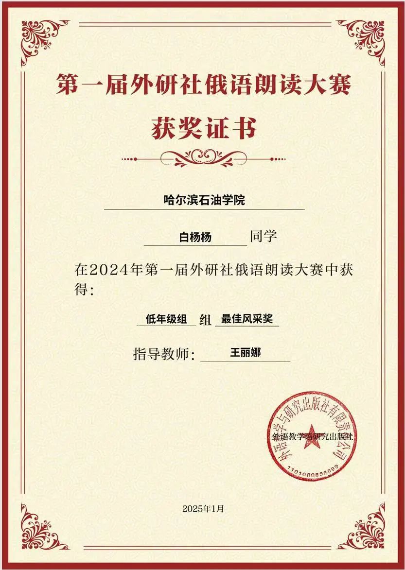 白杨杨同学在低年级组比赛中荣获三等奖,展现了其在俄语朗读方面的卓越才能。此外,她还获得了“最佳风采奖”,这一奖项旨在表彰在投票环节表现突出的选手,体现了白杨杨同学不仅在专业技能上表现出色,同时也赢得了广泛的公众认可和支持。