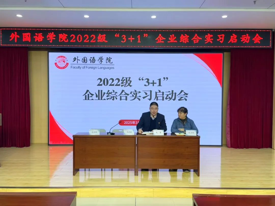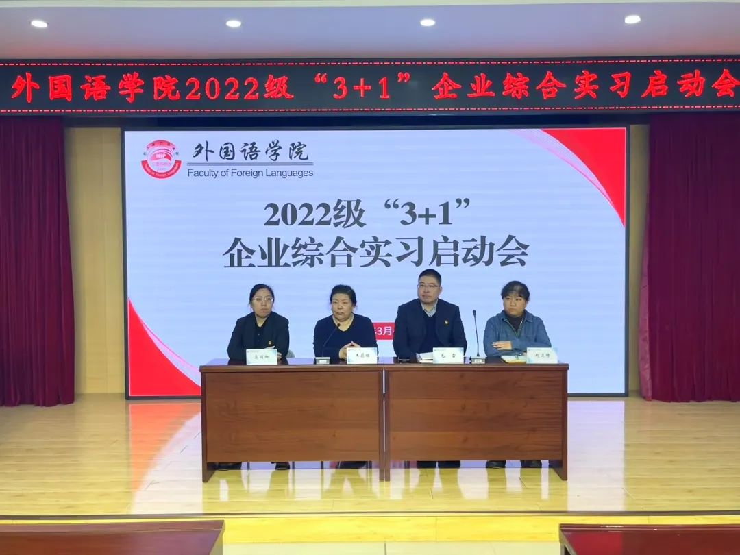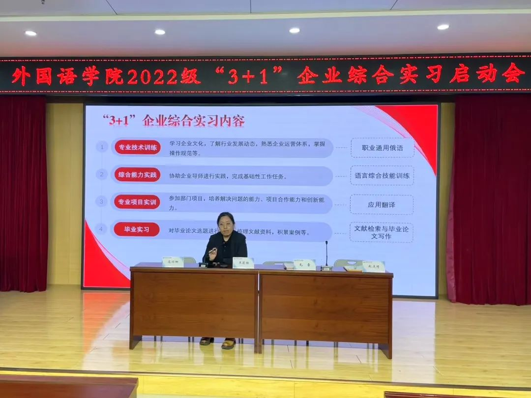 为深入推进校企协同育人模式,建立校企深度融合的长效合作机制,进一步提高人才培养质量,切实推动“3+1”人才培养模式的落地。外国语学院于3月4日召开2022级“3+1”企业综合实习启动会,会议由团总支书记赵连琦主持,院长王莉娅、副院长高丽娜、党总支书记毛雷,2022级全体同学参加了本次会议。